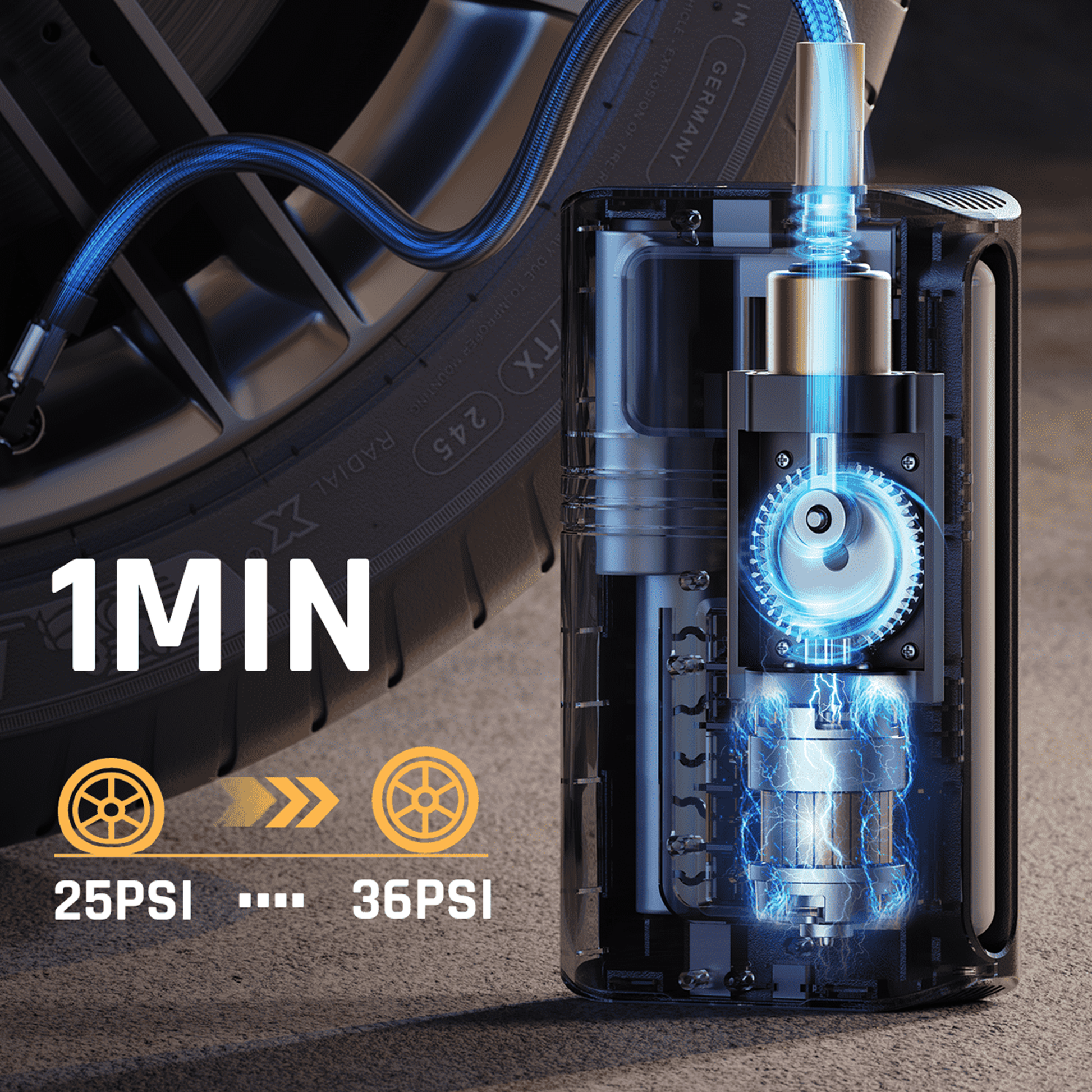 Performance | Full tire in 6 minutes, 25–36 PSI top-up in 1 minute |
