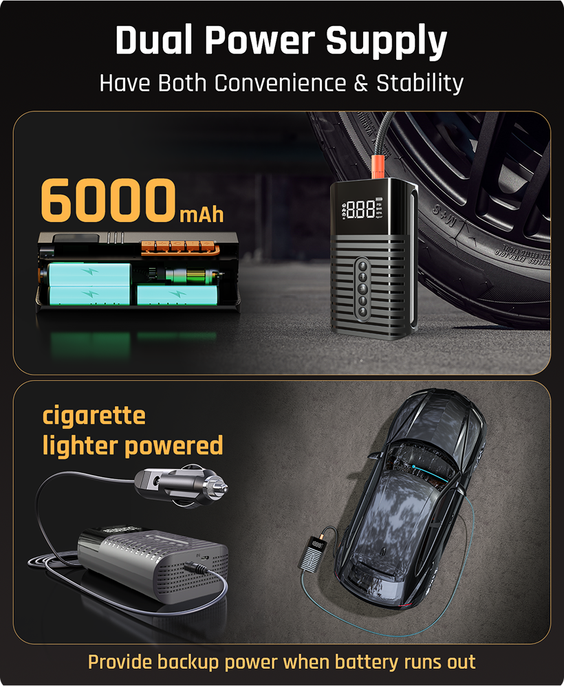 Switch between a 6000mAh rechargeable battery and 12V car power. Always ready when one source runs out.