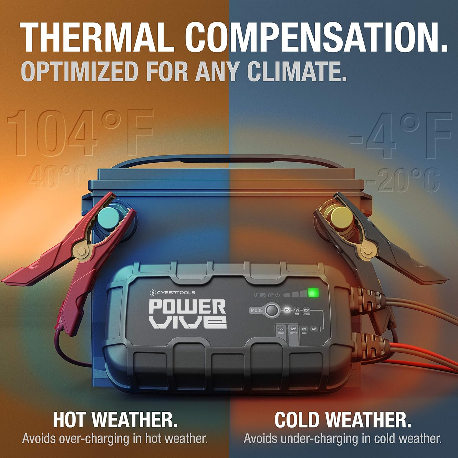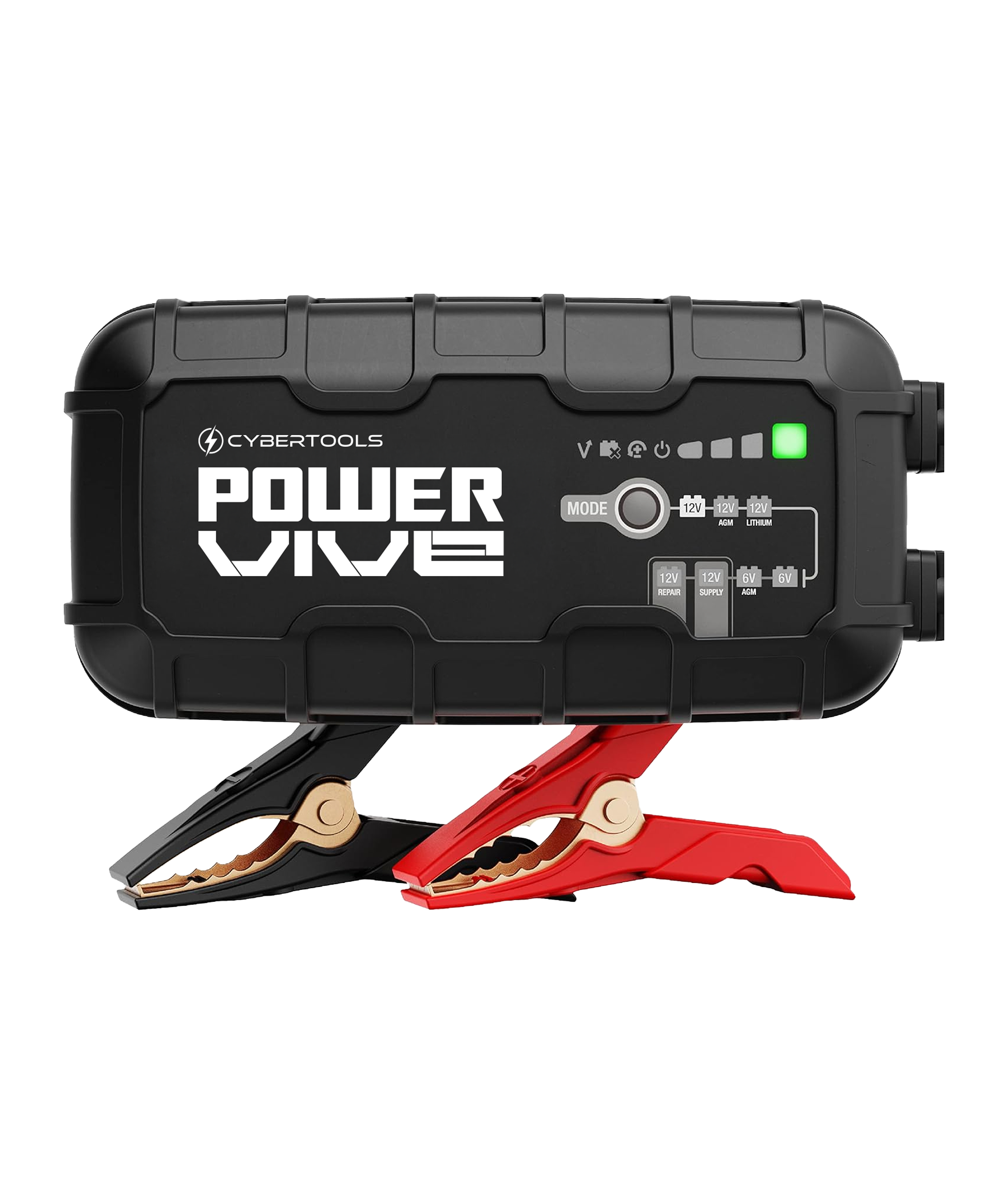 Whether you have a standard car battery, an AGM deep-cycle, a gel cell, or even a lithium-ion battery, PowerVive adapts to charge it properly. It handles both 6V and 12V batteries with ease, so one charger works for all your vehicles – from cars and SUVs to motorcycles and more.