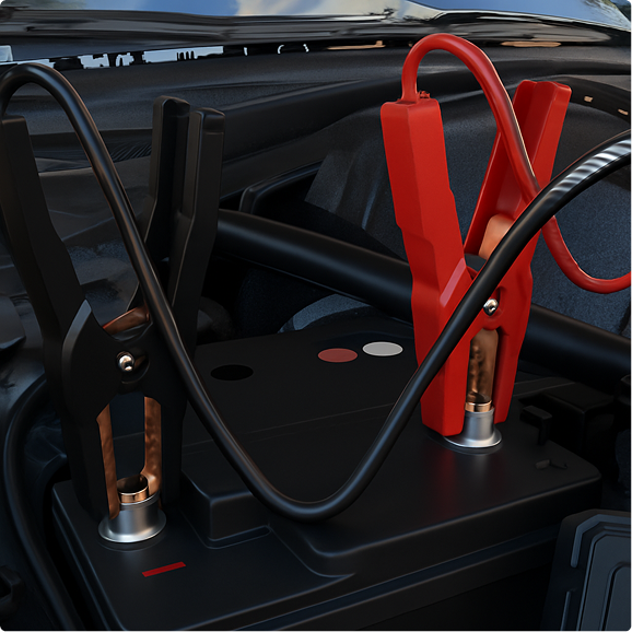 Connect the red clamp to the battery’s positive (+) terminal, then the black clamp to the negative(–) terminal. Ensure both clamps have clean, secure contact with corrosion-free metal surfaces.
