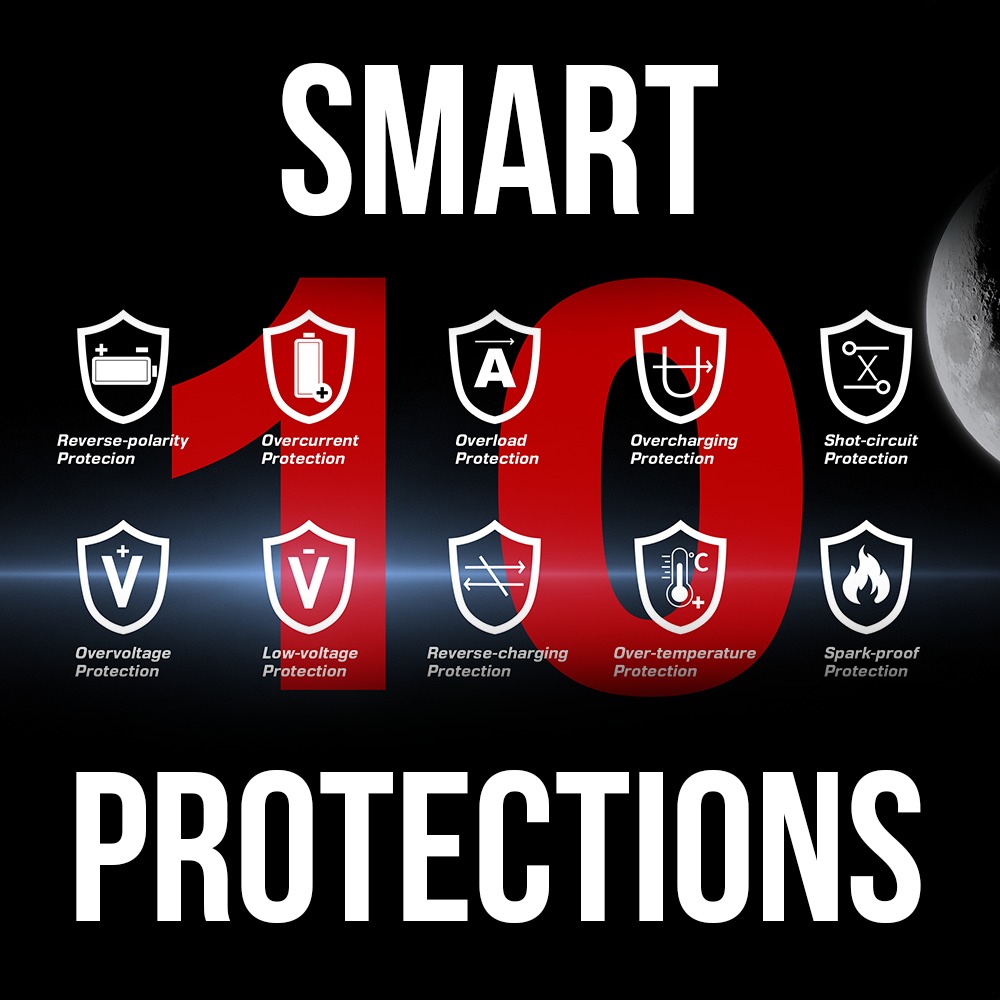 10 smart protections keep every start spark-free. So nothing happens if you connect it wrong. It’s completely spark-free and foolproof.