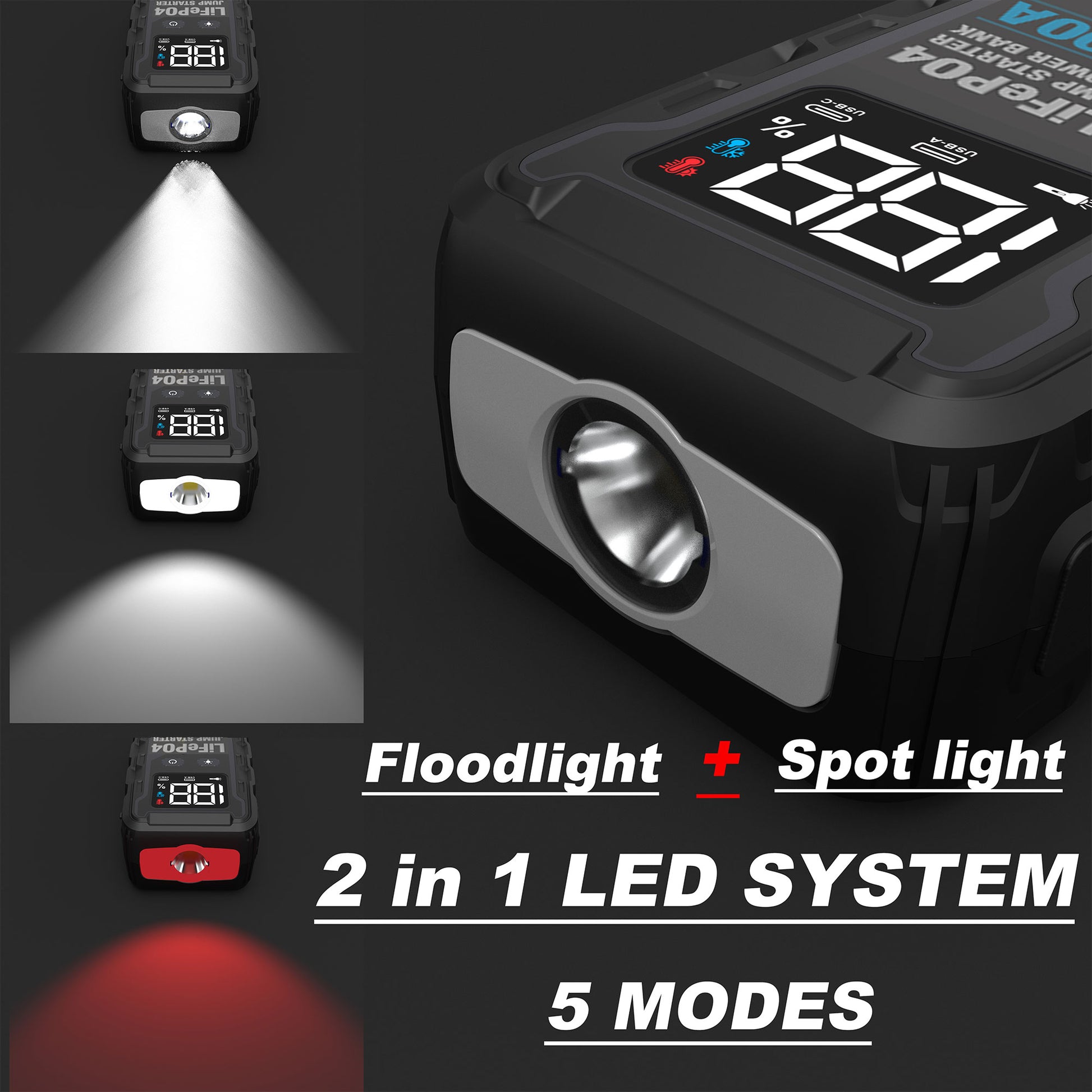 Yes. It includes 5 lighting modes: spotlight, floodlight, red light, SOS, and high/low beam — helpful for roadside emergencies or nighttime repairs.