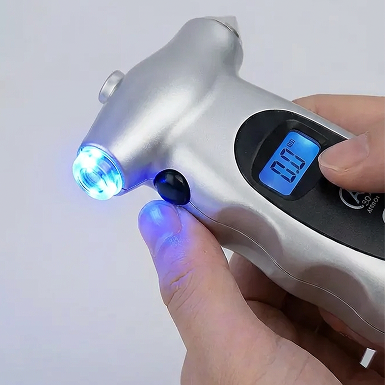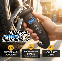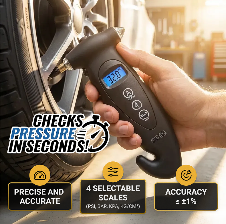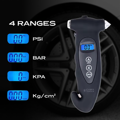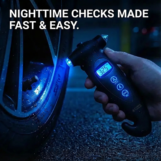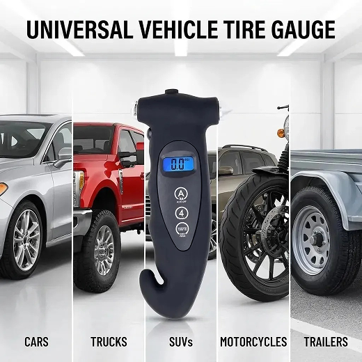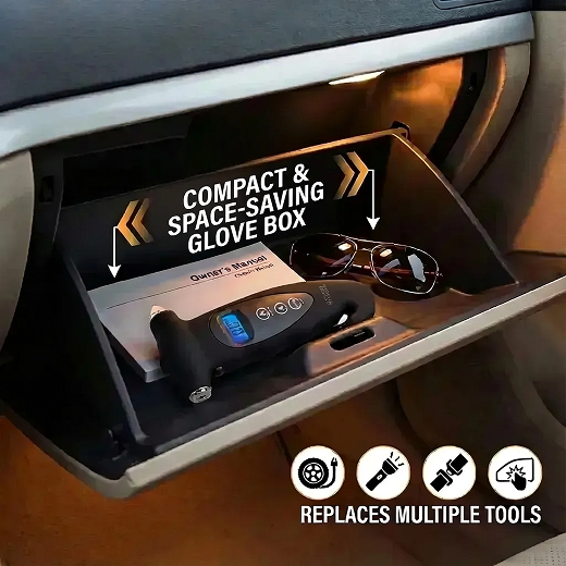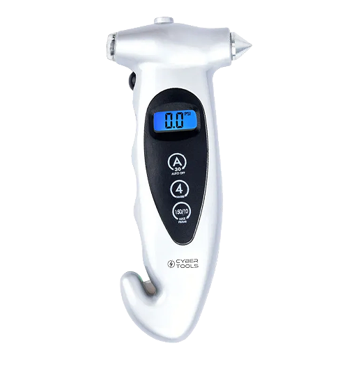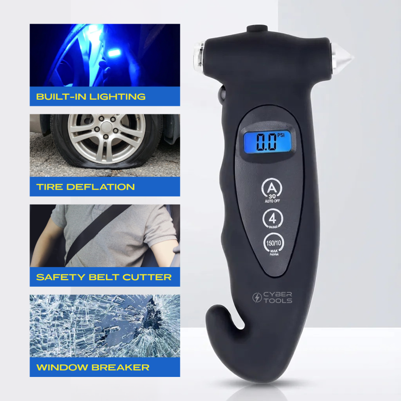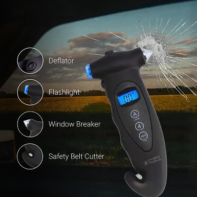 Includes a safety belt cutter, window breaker, flashlight, deflator, and digital pressure gauge — all in one rugged device.