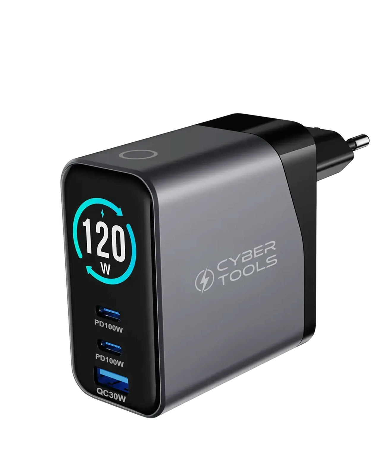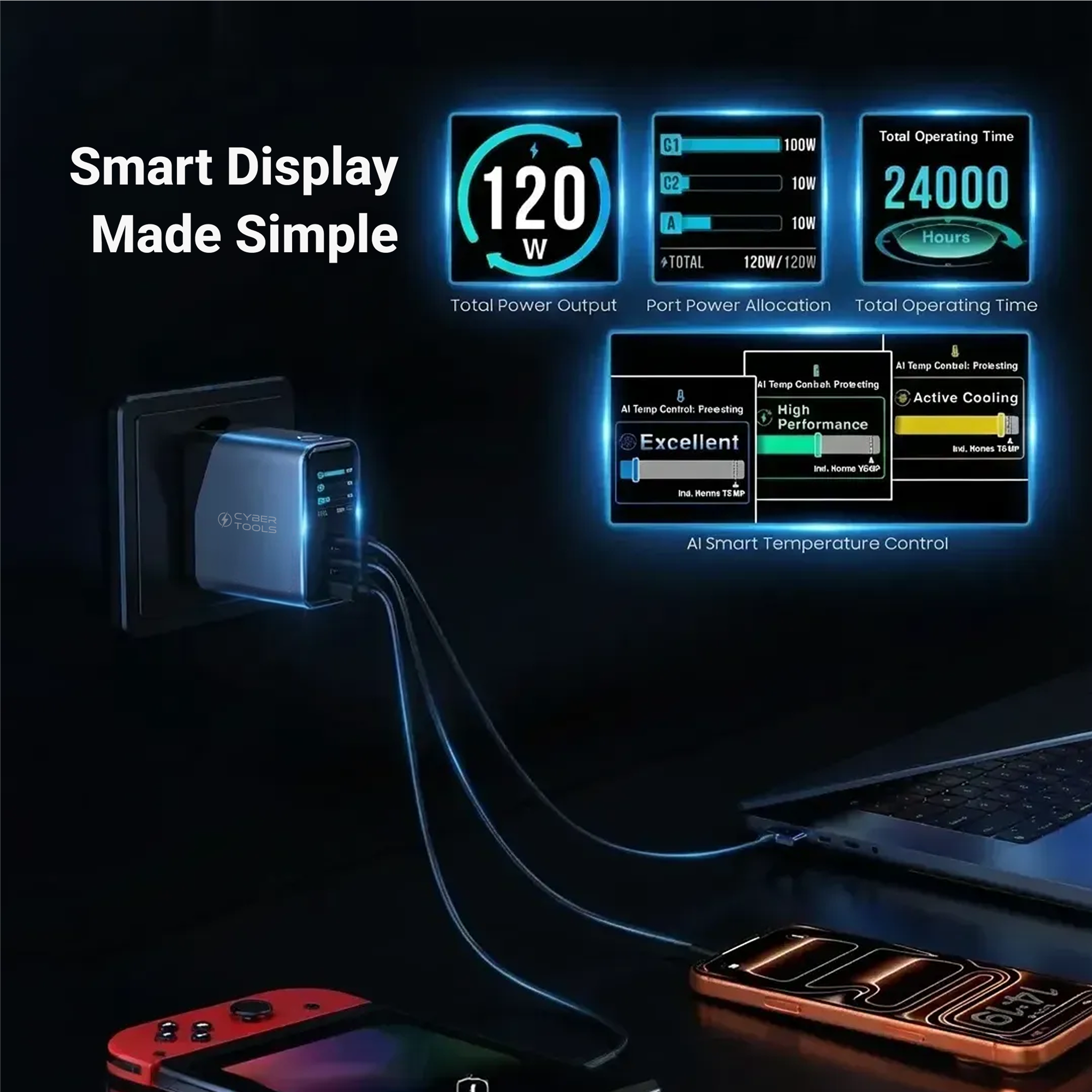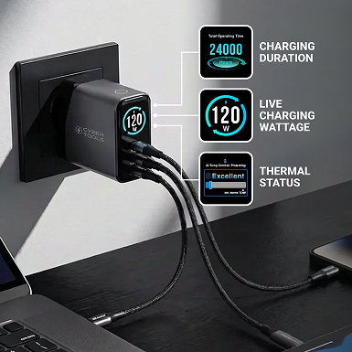 Built-in smart IC intelligently distributes up to 120W across ports.